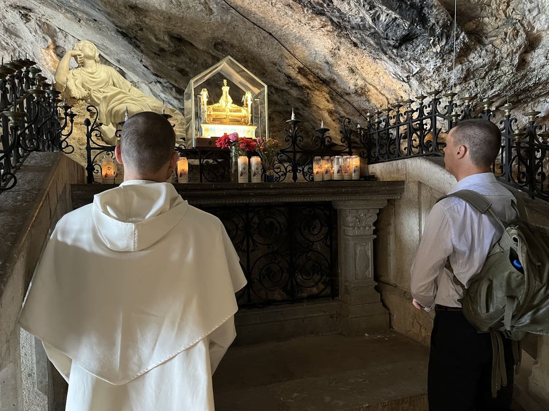 La journée à Saint Maximin, le célèbre ancien couvent dominicain, fut probablement pour nous la plus remarquable. Pour un jour, ce fut à nous d’assurer le culte divin dans cette basilique royale, avec la Messe à l’autel majeur et l’Office dans les stalles, dans le rite pour lequel elles furent conçues. Après avoir vénéré le chef de sainte Marie-Madeleine, et fait un temps d’oraison, nous nous disposâmes pour monter à la grotte de la Sainte Baume. Elle se trouve à mi-hauteur d’une impressionnante falaise, à huit cents mètres d’altitude, surplombant une forêt millénaire. Pour traverser celle-ci, nous prîmes le chemin du « canapé ». Le nom est trompeur : il n’y avait même pas de chemin mais plutôt des rocailles qui se succédaient jusqu’à la grotte. Pour garder l’esprit de pèlerinage, le Père Maître ajouta le chapelet chanté. Après une demi-heure intense, nous arrivâmes tout essoufflés à la grotte, mais l’enthousiasme nous mena à poursuivre la montée jusqu’à l’oratoire du Saint-Pilon, tout en haut de la falaise. On nous avait promis une vue splendide de toute la région et nous ne voulions en aucun cas la manquer. Pendant ce temps, un frère préféra rester à la grotte en contrebas pour parler du Christ à un groupe de druidesses. Au Saint-Pilon, la réalité fut bien différente : nous le trouvâmes à grand peine, car les nuages ne permettaient pas de voir à plus de cinq mètres. Finalement, nous chantâmes là-haut les vêpres.