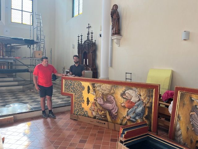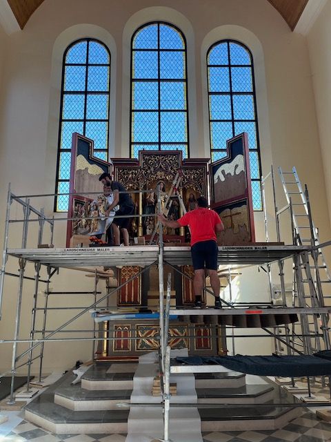 Après avoir déchargé l'autel, toute l'équipe, Remy Insam avec son épouse Maria, son premier ouvrier Dietmar Goller et Michael Crepaz, se mettent au travail. Pendant que Mme Insam déballe les centaines de pièces, les hommes, parfois avec l'aide des frères, montent l'autel, étage par étage : antependium, mensa, prédelle, retable, et couronnement. En quelques jours, deux années de travail, par six artisans, montent sous nos yeux émerveillés vers la voute de notre église. L'émotion est palpable. "C'est comme Noël, Pâques et Pentecôte à la fois !", dira Maria Insam. De nombreux frères viennent spontanement prier devant le nouvel autel.