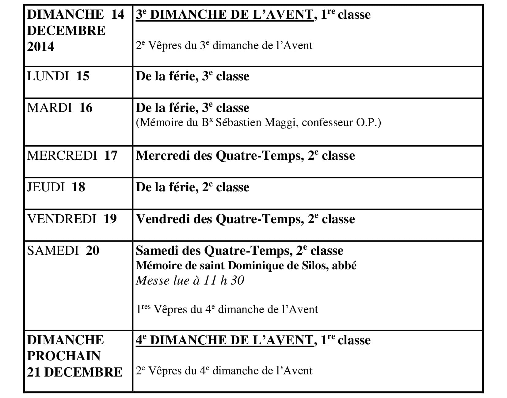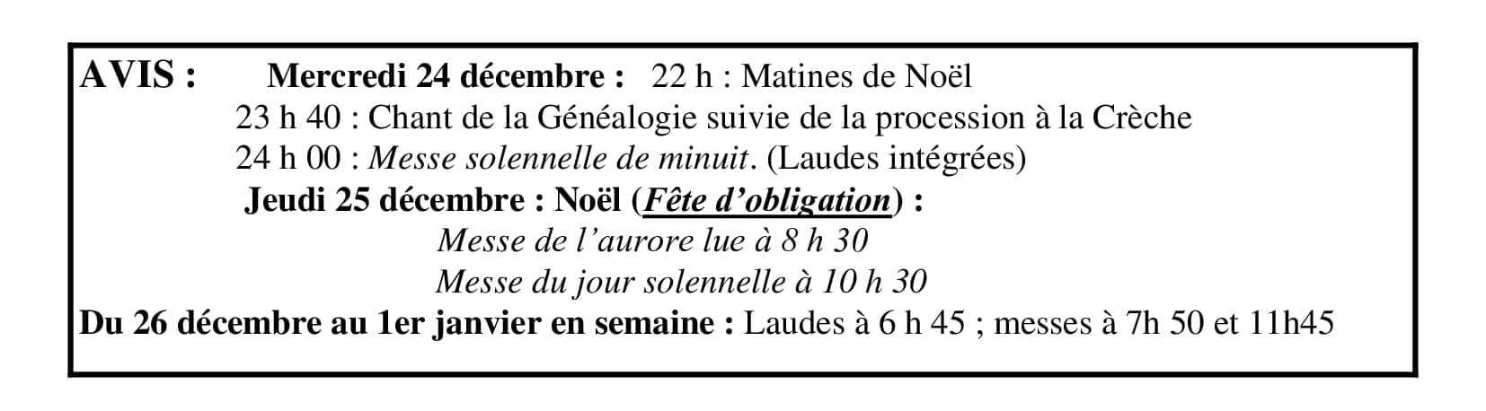 | Vêpres | 17h00 | 17h45 |
