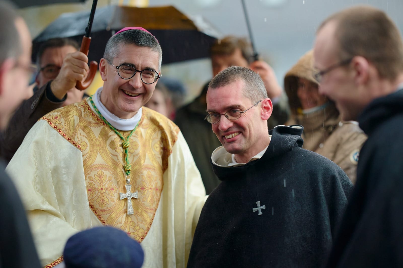 photo : Mgr Matthieu Dupont et le prieur de la Fraternité à l'issue de la cérémonie de consécration épiscopale, sur le parvis de la basilique de Pontmain samedi dernier (et sous une pluie de grâces !).